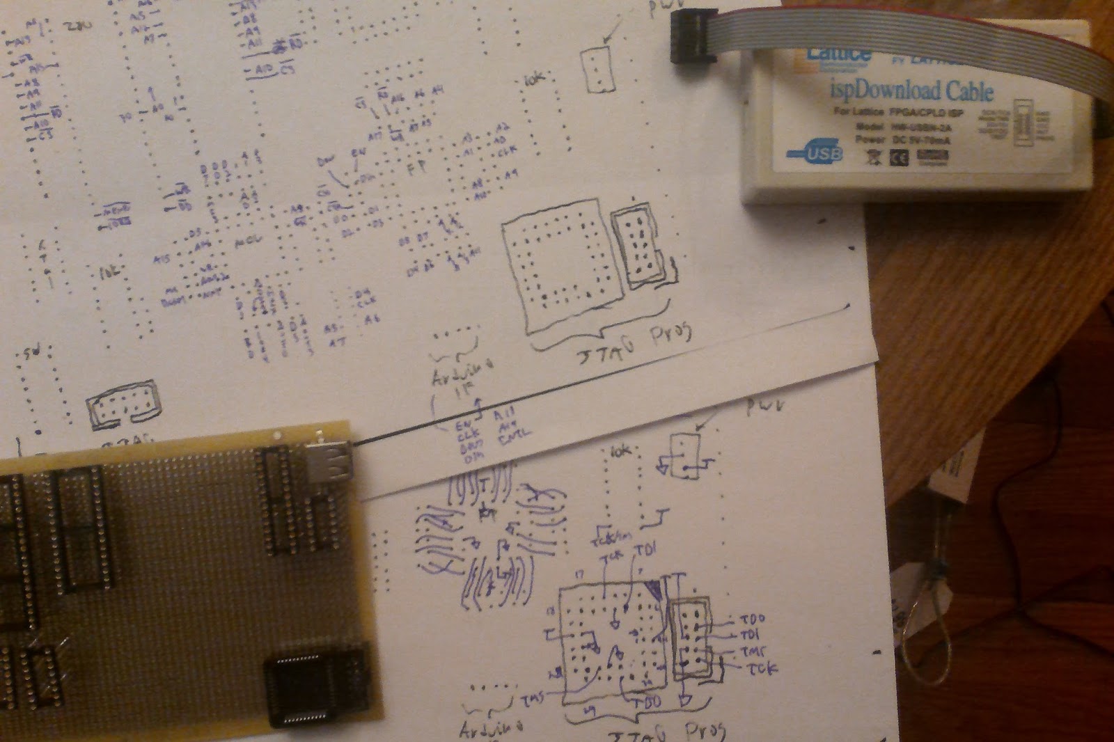 So, let me explain what this is. The top sheet shows the address lines according to location on the PCB. (Yes, I know that it’s not really a “printed” circuit board, but I still call it a PCB in my head.) The bottom sheet shows the design for the dedicated JTAG programmer. The lower left of the PCB shows that dedicated programmer PLCC-44 socket and the 2x5 pin header for the JTAG connecter. The ispDownload Cable in the upper right of the picture is my Lattice JTAG programmer.