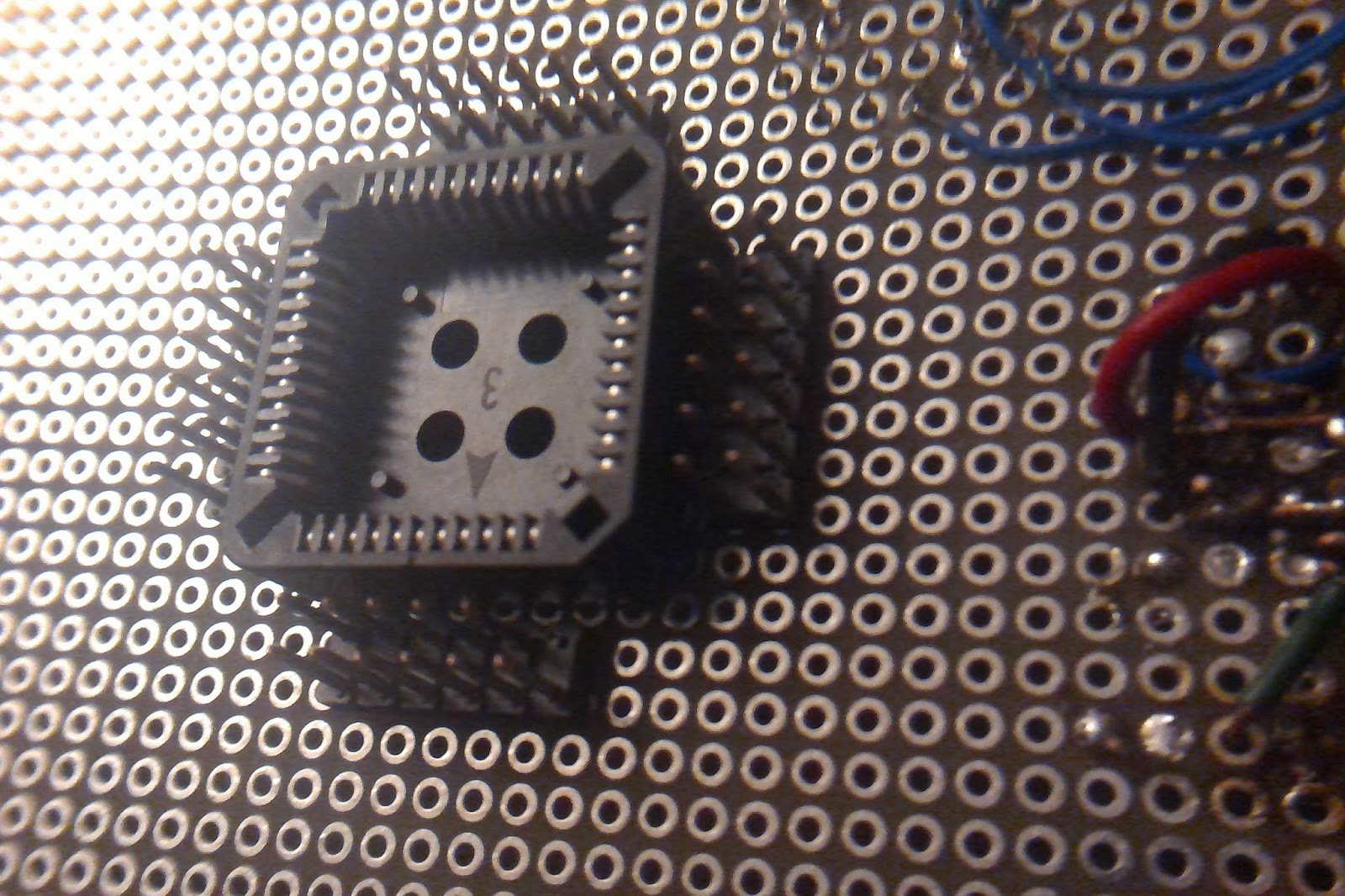 CPLD Socket #2 Soldered In Jul 21, 2015 • Mark Here is the solder side of the socket and the 4 headers for wire-wrap. And here is the wire-wrap side. Now to check continuity and for adjacent shorts….