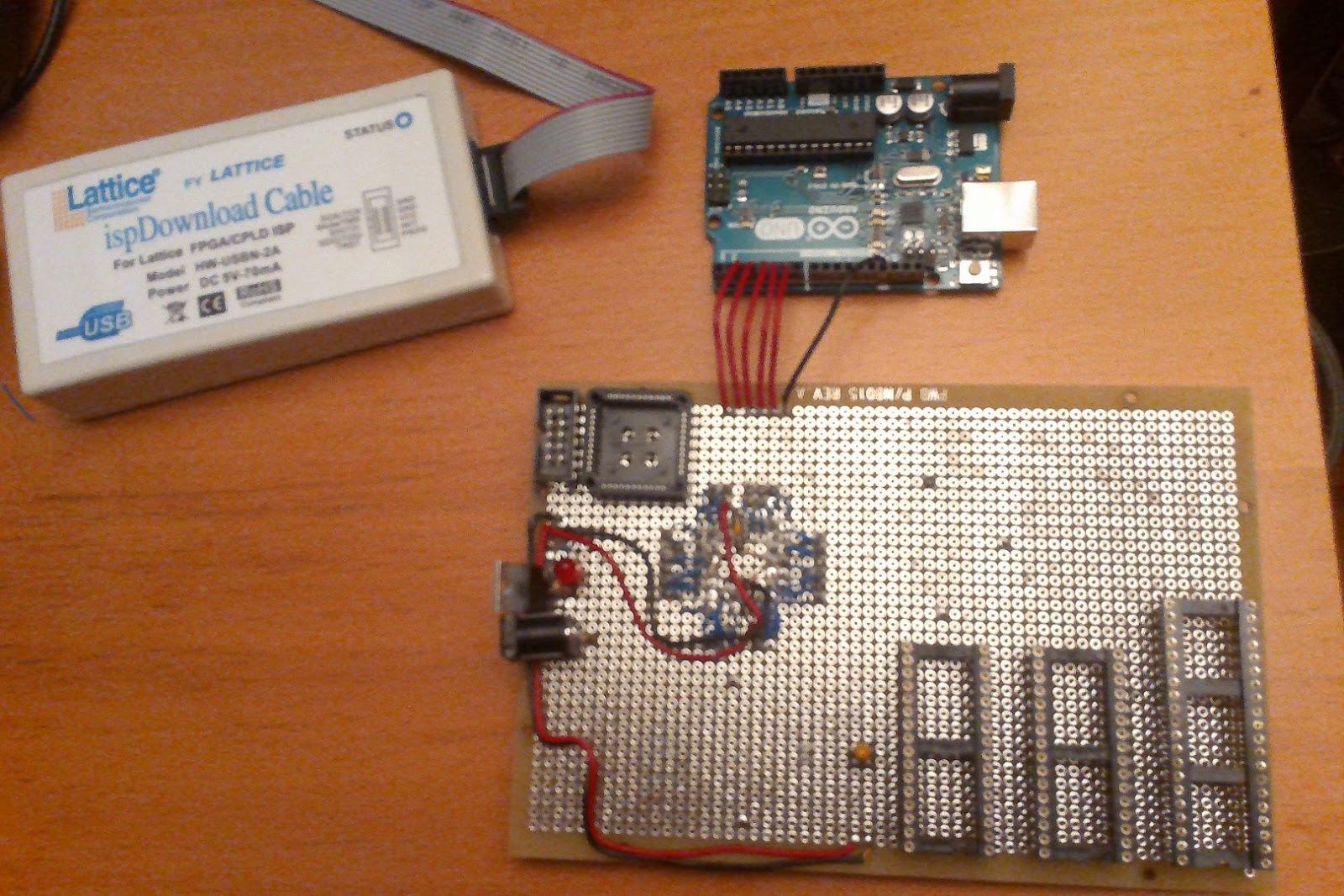 Tomorrow, I'll make sure that the CPLD powers up and that the inputs look like they're floating. Then I'll wire wrap the Arduino wires to the CPLD and see if I can control the CPLD outputs as I expect. A scope or logic analyzer would help, but I'll just get creative since I have neither. Probably, I'll add a mode to my Arduino code that will let me single step through the operations. Or maybe just slow them down so my multimeter can see signals changing.