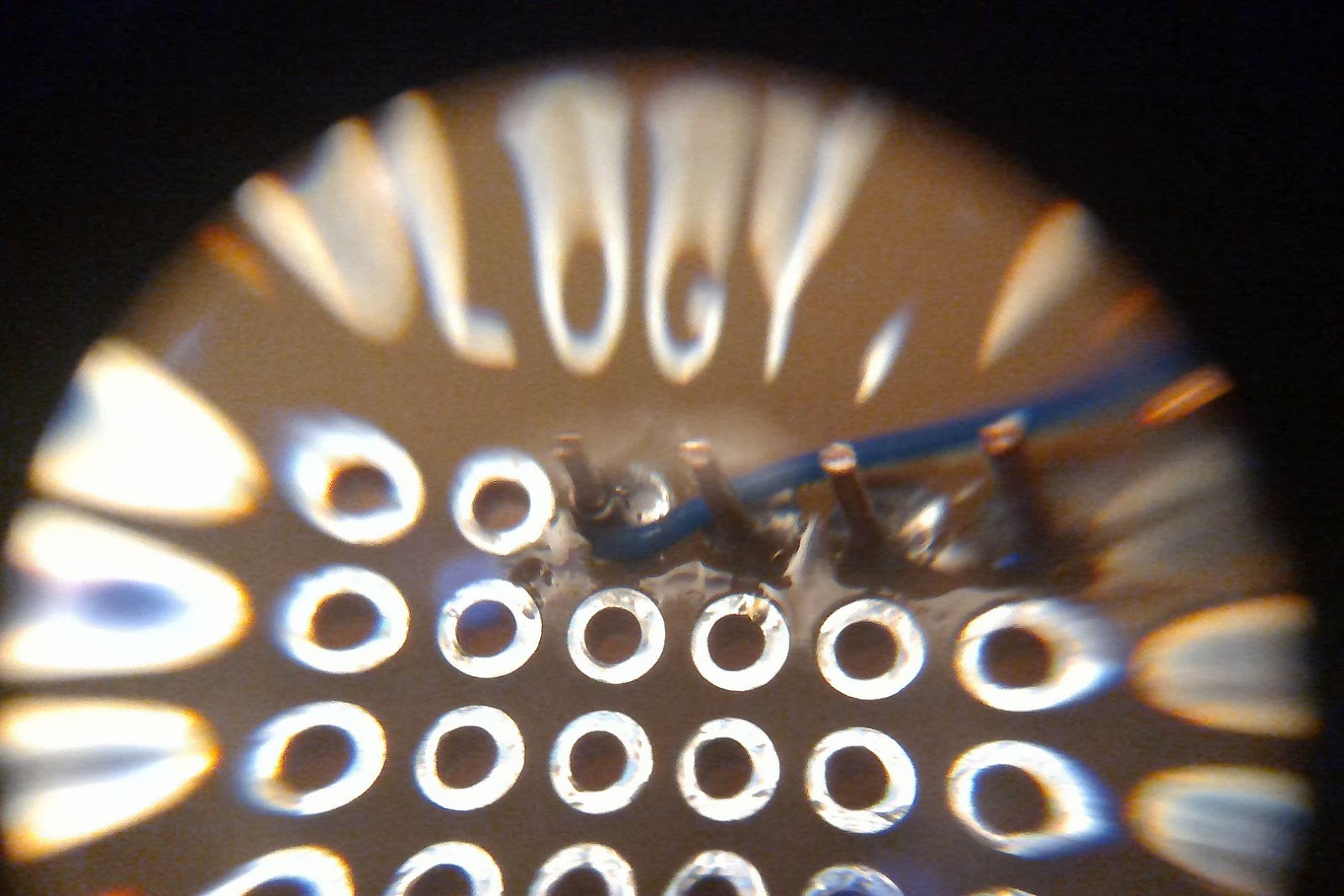 I also have to think about power delivery. So I soldered in two pieces of wire Here are the front and back. The two rails of copper wire in the upper picture run along 5 holes which will take other wires so they can be connected. The lower picture shows the other side with a tantalum capacitor that will keep the 5V close to 5V under sudden loads.