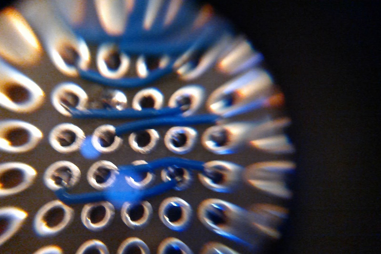 Here is some wiring. pre solder through the jeweler’s loupe over my camera lens. This wiring is flat. Each wire is cut to 6 of those clad holes. Then stripped by eye. Then a bend down at one end and a bend to the right immediately followed by a bend down at the other end. Then I slip the ends in with tweezers. I do 38 for each of the remaining CPLD, and each one takes about a minute. So it’s a project for a morning. But it’s working. I will experiment with soldering all at once vs one wire at a time tomorrow. Having the conical tip for the soldering iron is certainly good.